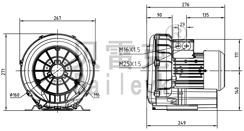 最大風(fēng)量:140m3/h 最大正壓:100mbar 最大負(fù)壓:100mbar 防護(hù)等級:IP55 噪音:56db 重量:13Kg